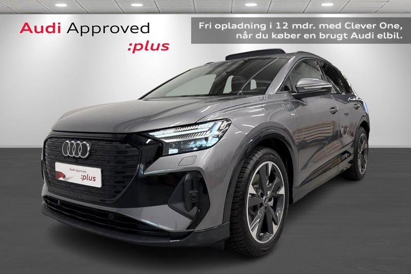 Audi Q4 e-tron Edition S line – veludstyret, sportslig el-SUV i tyfongrå metallak. Tyfongrå metallak og Sort optikpakke giver et skarpt, eksklusivt udtryk på vejen. Panoramaglassoltag sørger for et lyst og luftigt kabinemiljø for både fører og passagerer. Elektriske forsæder øger komforten og gør det nemt at finde den perfekte kørestilling. 20" alufælge i 5-Y-eget design i grafitgrå med glanspolerede detaljer understreger det dynamiske look. Svingbart anhængertræk gør det nemt og praktisk at tage trailer eller cykelholder med. En gennemført Audi Q4 e-tron Edition S line til dig, der vil kombinere design, udstyr og funktionalitet i hverdagen. Kontakt os for flere detaljer eller for at booke en prøvekørsel.