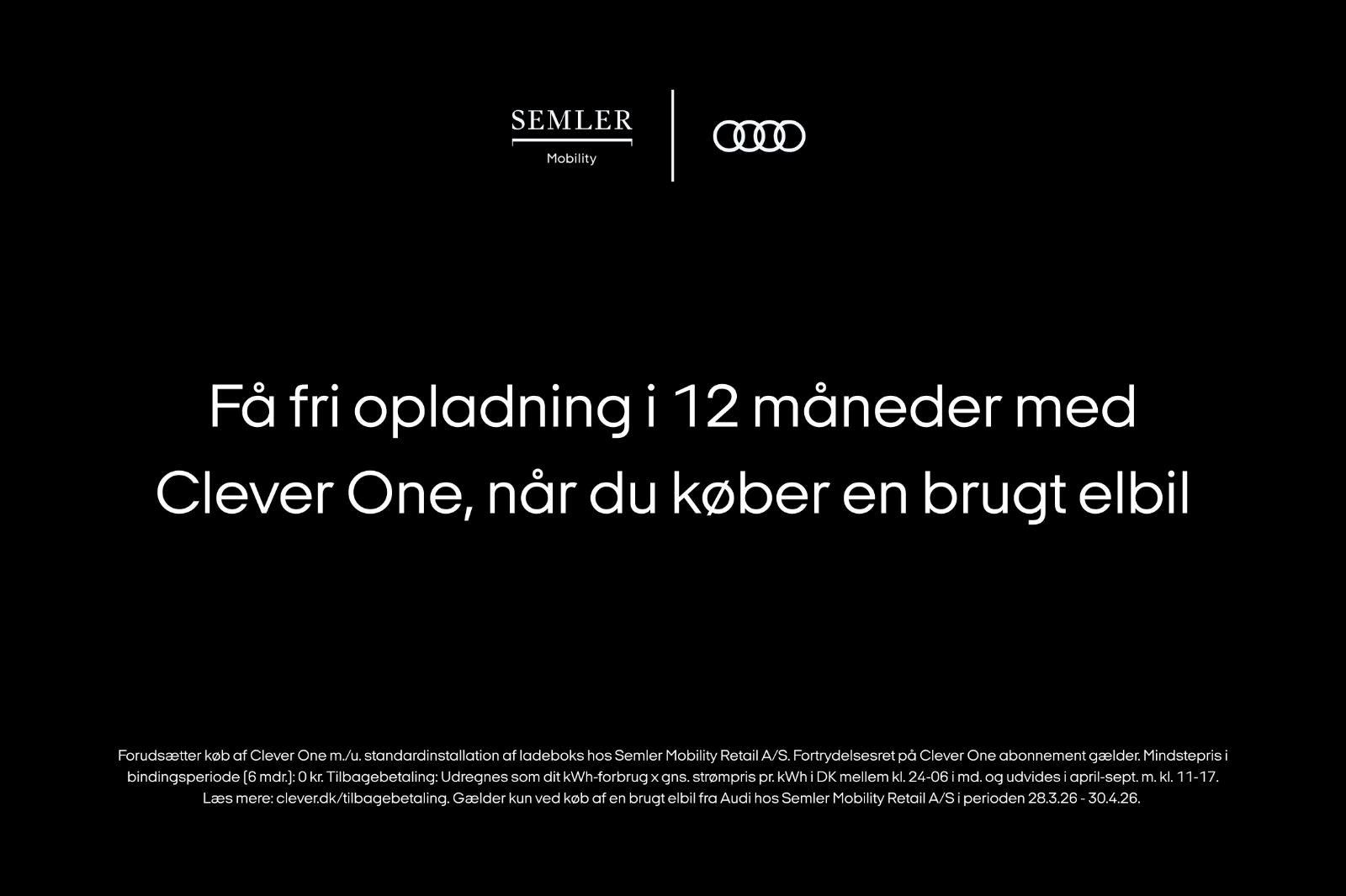 * Forudsætter køb af Clever One m./u. standardinstallation af ladeboks hos Semler Mobility Retail A/S. Fortrydelsesret på Clever One abonnement gælder. Mindstepris i bindingsperiode (6 mdr.): 0 kr. Tilbagebetaling: Udregnes som dit kWh-forbrug x gns. strømpris pr. kWh i DK mellem kl. 24-06 i md. og udvides i april-sept. m. kl. 11-17. Læs mere: clever.dk/tilbagebetaling. Gælder kun ved køb af en brugt elbil fra Audi hos Semler Mobility Retail A/S i perioden 28.3.26 - 30.4.26.